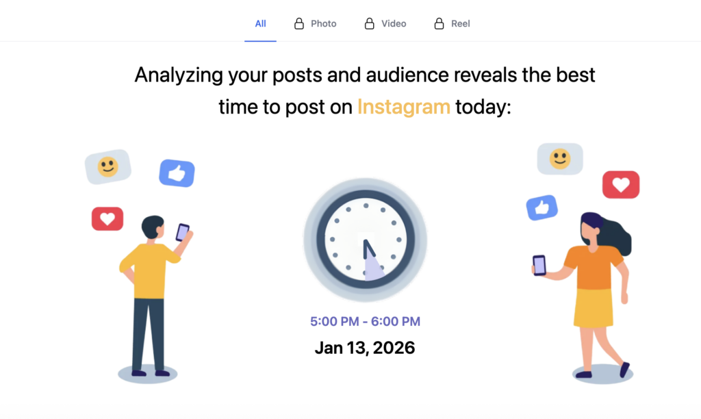 The free version lets you find the best time to post on Instagram for the next 3 days. The paid version includes week-on-week analysis and also lets you find the best time to post Instagram reels, posts, and videos.