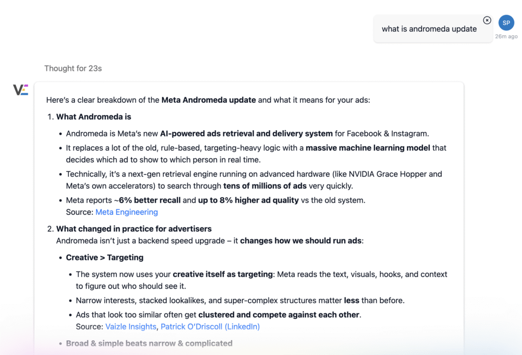Here’s a live example of Vaizle AI confirming Meta’s latest andromeda update: