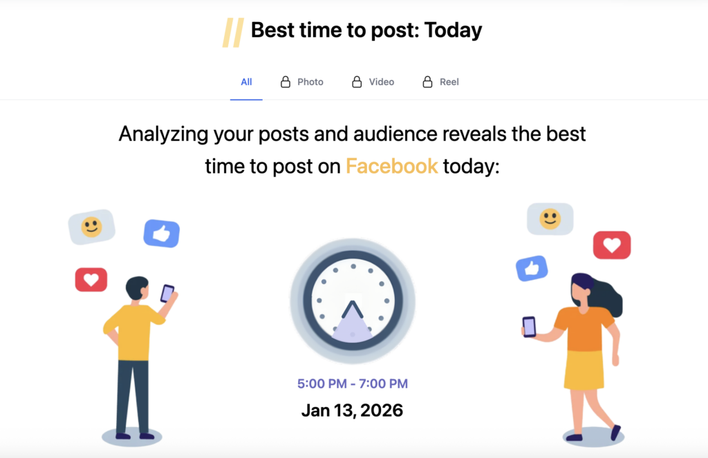 However, the best posting time can vary significantly by industry and audience. You can use Vaizle’s free Best Time to Post on Facebook tool to analyze when your specific audience is most active and responsive.