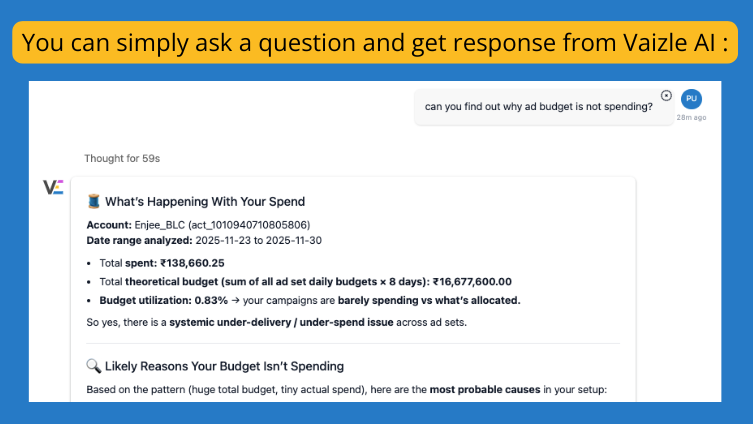 That’s where Vaizle’s AI Agent for Meta Ads comes in. Instead of spending hours digging through spreadsheets and dashboards, you can simply ask questions in plain English and get instant, actionable insights. Want to know which ad set is performing best? Which audience segment has the highest ROAS? How your campaigns performed last month compared to this month?