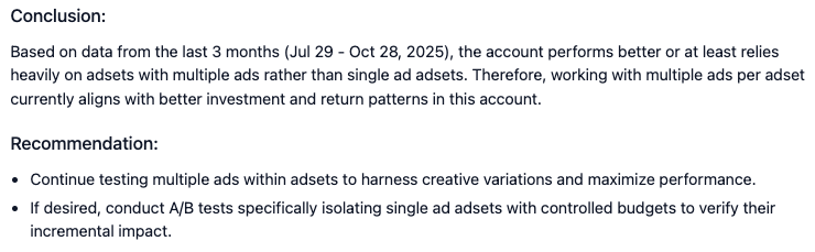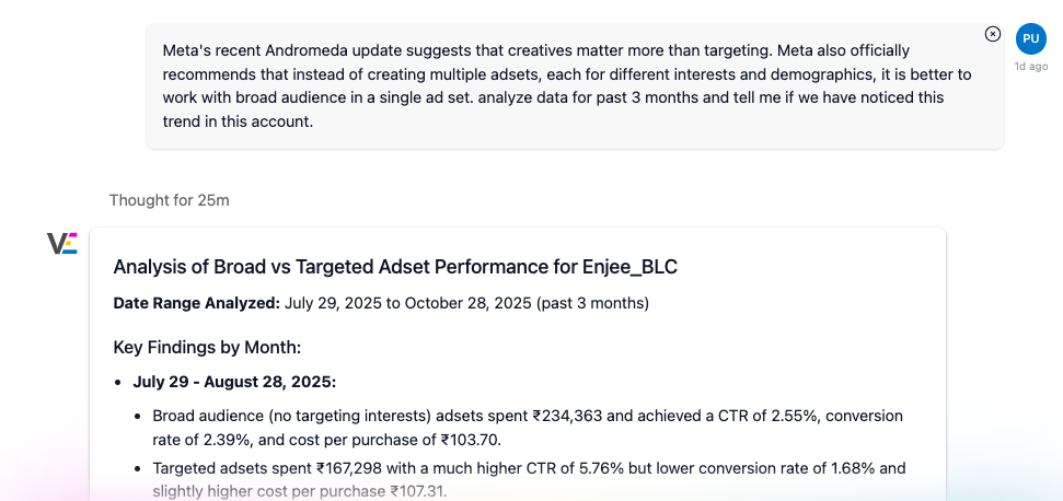 For example: I asked about Andromeda effect on Facebook Ads in one account. Vaizle AI conducted a comprehensive analysis and confirmed these patterns were true.