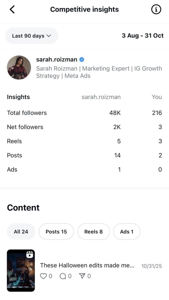 Instagram’s newest competitive insights update was first spotted by Sarah Roizman, who works as an Instagram Growth Strategy Expert. She shared a thread on how users can now compare their account performance to similar other profiles, based on metrics/factors like follower growth, posting frequency, Reels, and even ads.