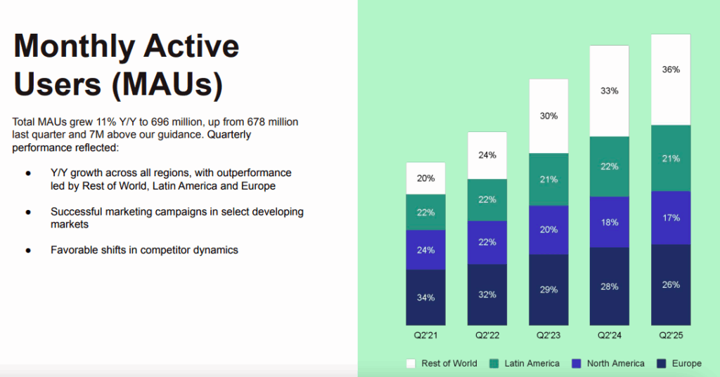 As of Q2 2025, the total number of monthly active users (MAU) increased to 696M globally.