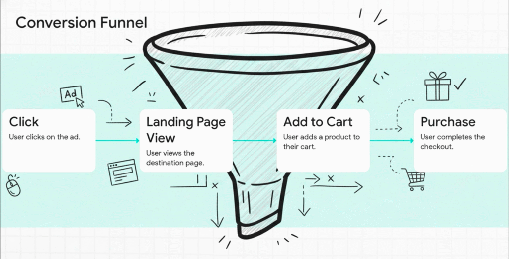 Break your funnel into checkpoints: Click → Landing Page View → Add to Cart (or Lead) → Purchase (or Qualification)